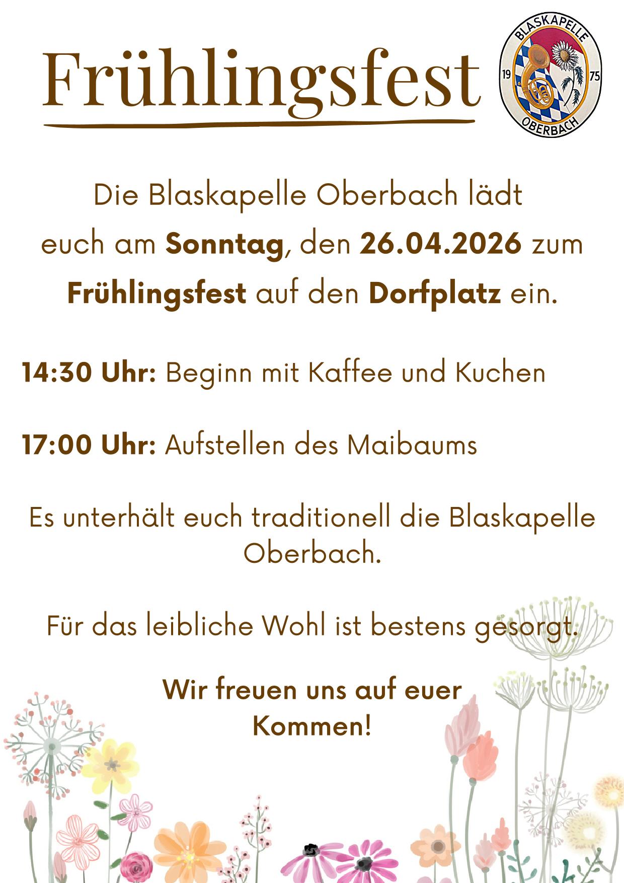 Frühlingsfest – Blaskapelle Oberbach + Zu Google Kalender hinzufügen + iCal / Outlook export Datum Apr. 26 2026 Uhrzeit 14:30 Veranstaltungsort Dorfplatz Oberbach Oberbach Kategorie Essen und Trinken Musik Unterhaltung Veranstalter Blaskapelle Oberbach Teile diese Veranstaltung